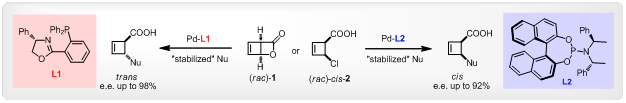 Story I: Allyl palladium(II) complexes represent key intermediates in catalytic allylic substitution (or Tsuji-Trost) reactions. We have recently reported unusually strong ligand effects in the diastereodivergent asymmertric synthesis of disubstituted cyclobutenes through palladium-catalyzed allylic alkylation.[1] With the regard to the mechanistic understanding of this transformation, we will herein present our findings on the unique structure and reactivity of cyclobuten-3-yl-palladium complexes as well as their unprecedented behaviors in solution.[2]