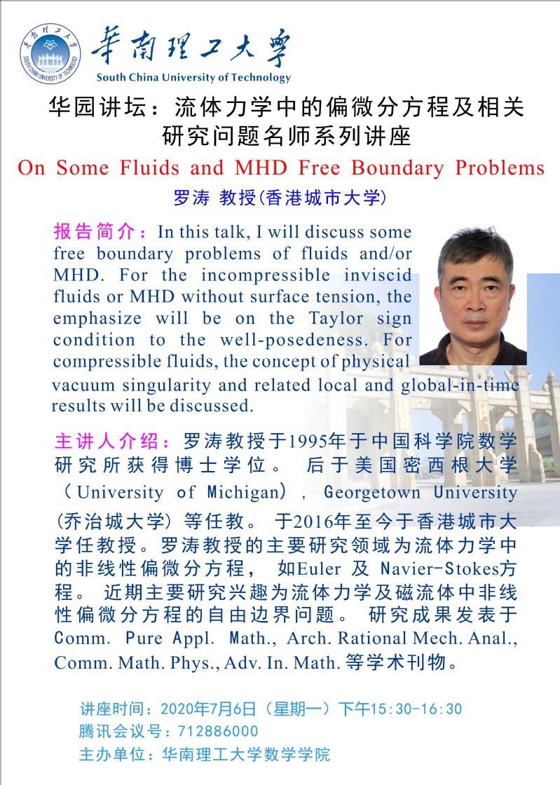 华园讲坛:流体力学中的偏微分方程及相关研究问题名师系列讲座(罗涛 教授)