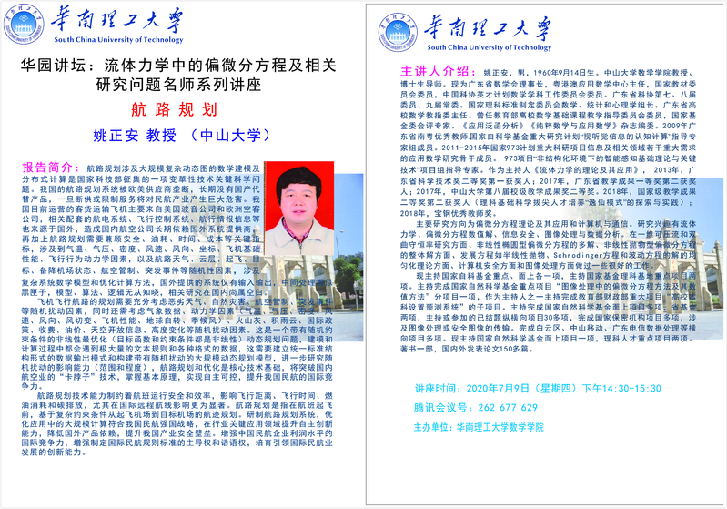 华园讲坛:流体力学中的偏微分方程及相关研究问题名师系列讲座-航路规划(姚正安 教授)