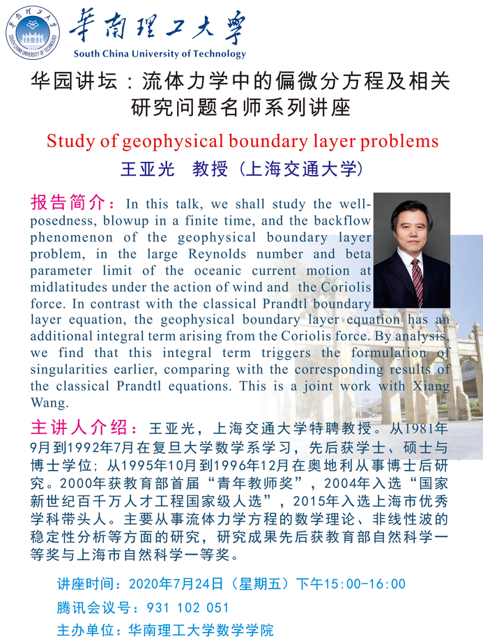 华园讲坛:流体力学中的偏微分方程及相关研究问题名师系列讲座(王亚光 教授)