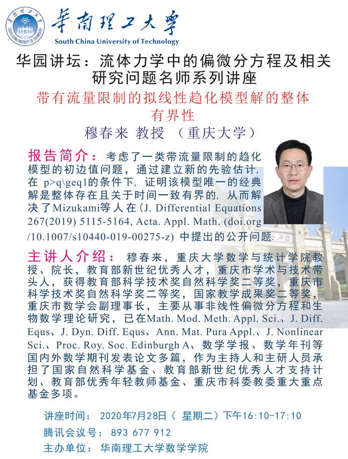 华园讲坛:流体力学中的偏微分方程及相关研究问题名师系列讲座(穆春来 教授)