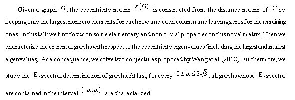 报告题目3:Characterizing the extremal graphs with respect to the eccentricity eigenvalues, and beyond