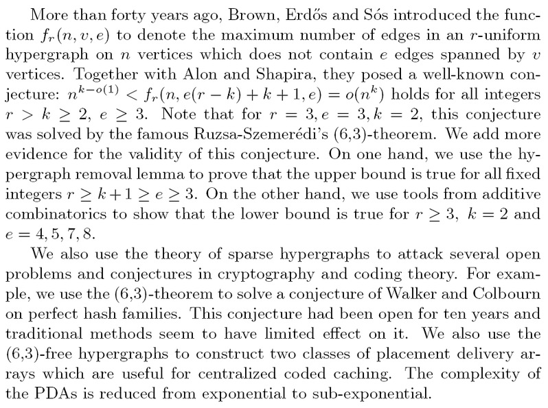 报告人简介:葛根年,首都师范大学特聘教授、国家杰青、国家百千万人才、北京学者。长期从事组合数学、编码理论、信息安全、压缩感知、数据科学等数学与信息交叉科学研究。迄今共发表SCI论文200余篇,并被SCI他引1900余次,其中:60余篇发表在国际组合数学及信息学领域内顶尖刊物 《Journal of Combinatorial Theory, Series A》《Journal of Combinatorial Theory, Series B》《SIAM Journal on Discrete Mathematics》《IEEE Transactions on Information Theory》及《IEEE Transactions on Signal Processing》上。自2014年爱思唯尔(Elsevier)发布“中国高被引学者(Most Cited Chinese Researchers)”榜单以来,一直进入榜单。同时,入选美国斯坦福大学发布的“2020全球前2%顶尖科学家(World's Top 2% Scientists 2020)”榜单、美国数学会发布的“高被引数学家(Most cited mathematicians)”榜单。现任中国数学会组合数学与图论专业委员会主任、国际组合数学及其应用协会“Medals Committee Member”(全球共3人)。目前受邀担任国际组合数学界顶尖SCI期刊《Journal of Combinatorial Theory, Series A》、国际编码密码界权威SCI期刊《Designs, Codes and Cryptography》、国际组合设计界权威SCI期刊《Journal of Combinatorial Designs》、国际代数组合界权威SCI期刊《Journal of Algebraic Combinatorics》、国内权威SCI期刊《中国科学:数学》、国内SCI期刊《高校应用数学学报》的编委。曾获国际组合数学及其应用协会颁发的“Hall Medal”、中国青年科技奖、教育部自然科学二等奖、浙江省科学技术二等奖。