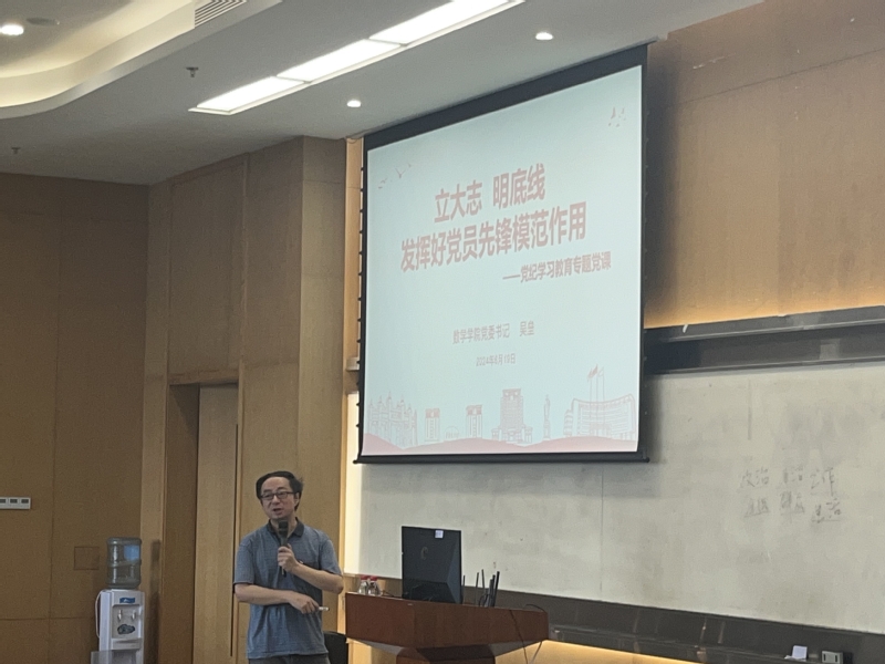 2024年6月19日,数学学院在清清文理楼3A01会议室举办了一场别开生面的党纪学习教育专题党课,由数学学院党委吴垒书记主讲,全体学生党员参加。本次党课以“立大志,明底线,发挥好党员先锋模范作用”为主题,旨在增强学生党员的党纪意识,提升党性修养。