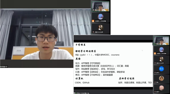 闫韶琛同学认为大一新生要做好时间安排,运用手机软件合理安排任务,与老师打好配合,充分与老师进行交流。蒋新宇同学推荐了许多英语干货与计算机学习网站,为同学们提供学习资源。穆泰宇同学认为同学们需加强自主管理与学习,提高自身效率。孙祥丰同学认为同学们需要提高主动性,不断自学增强学习能力,利用更多空闲时间来拓展自己的学习领域。黄婧同学认为,同学们需要尽快适应全英教学环境,利用好全英教材,合理安排时间。潘雨菲同学认为做好课前预习工作是十分重要的。谭晓璐同学认为高中学习和大学学习存在着很大的不同,同学们应尽快适应角色的转变。李天骋同学认为,大学有了更多自由支配的时间,同学们一定要加强学习自主性。