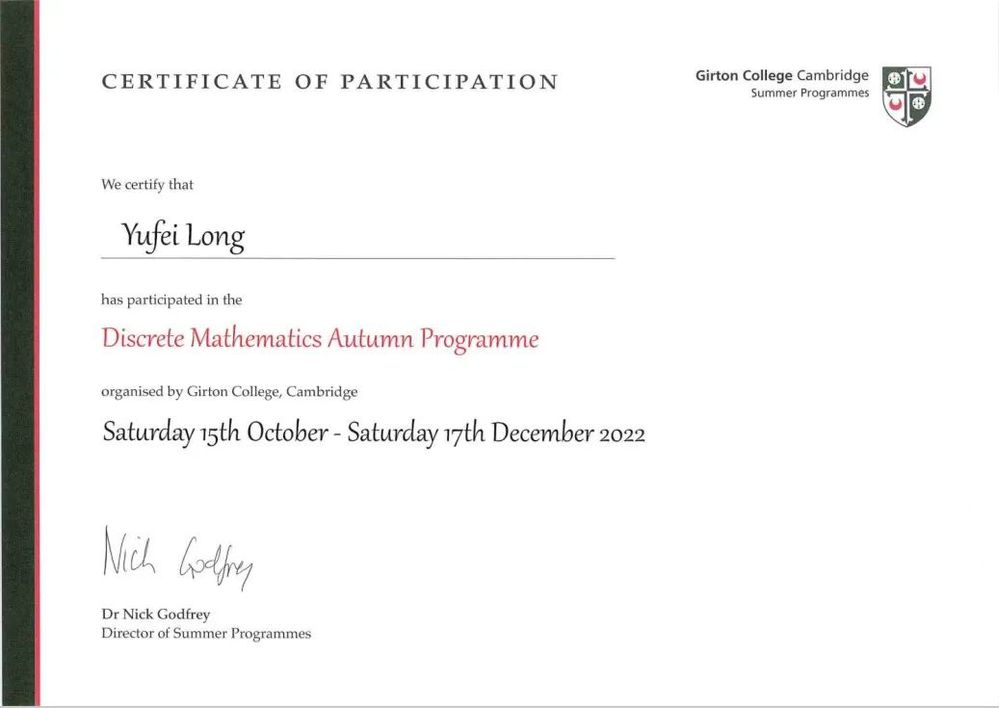 此前,铭诚书院、未来技术学院2021级人工智能专业龙雨菲同学参与了剑桥大学离散数学课程,并成为该课程取得A等级的四位同学之一。