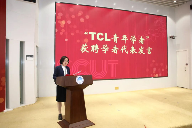“TCL青年学者”获聘学者代表,环境与能源学院陈燕教授发言表示高校教师肩负人才培养和科技创新的使命,今后将加倍落实立德树人根本任务,围绕国家重大战略方向,把论文写在祖国大地上。