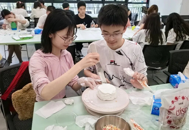 奶油在蛋糕胚上堆叠的每一道纹路,都需要耐心与专注,恰似书院四载时光,润物无声的陪伴。这场手作不仅是一场体验,更是在传递一份温暖,回味成长路上的点滴美好。