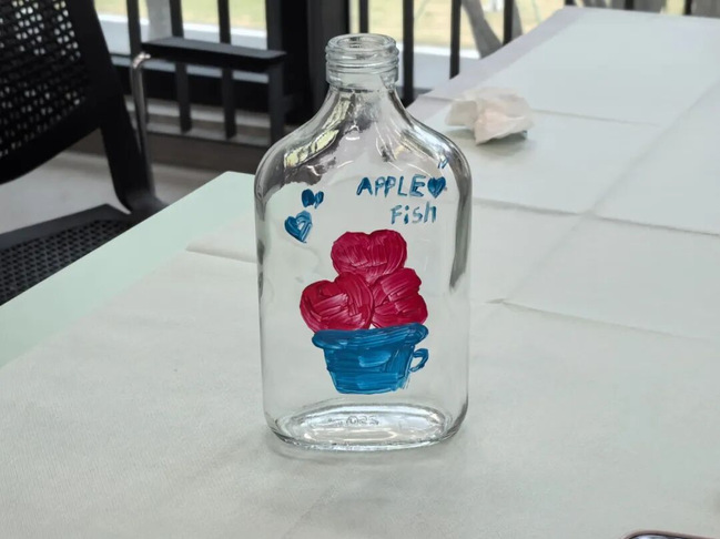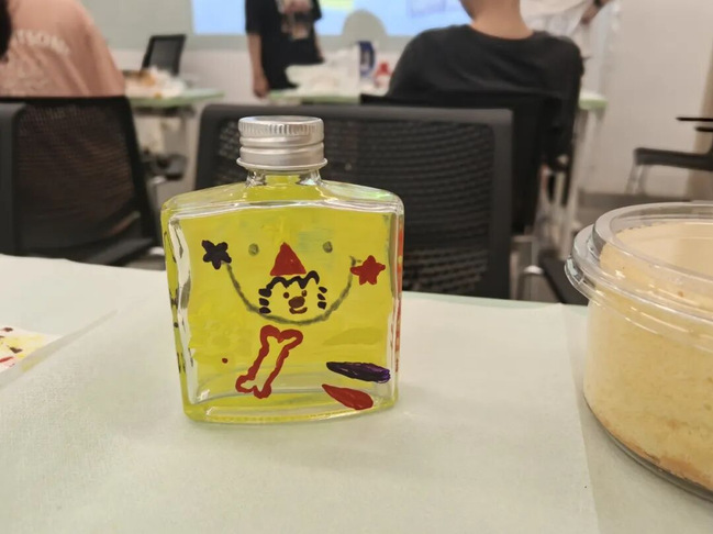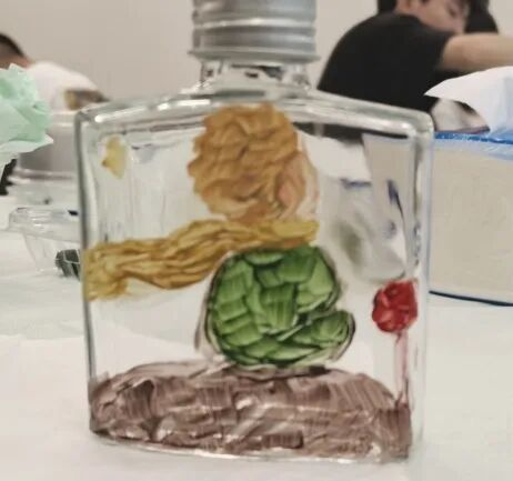 生日会的另一侧,摆放着玻璃瓶和颜料盘。参与者们拿起画笔,在瓶身上绘制无限可能。透明玻璃瓶化身记忆容器,有人以蓝色为主调,尝试绘制出浩瀚星空,有人用彩色画出夏日的清凉,有人用金色勾勒出标志性的围巾,小王子的身影被定格在玻璃瓶。