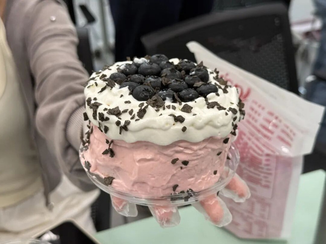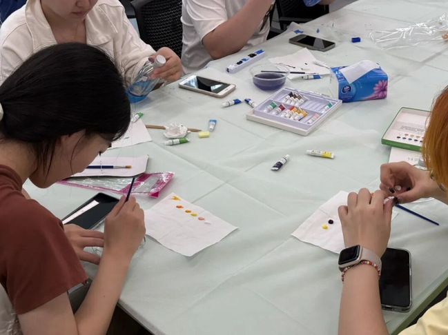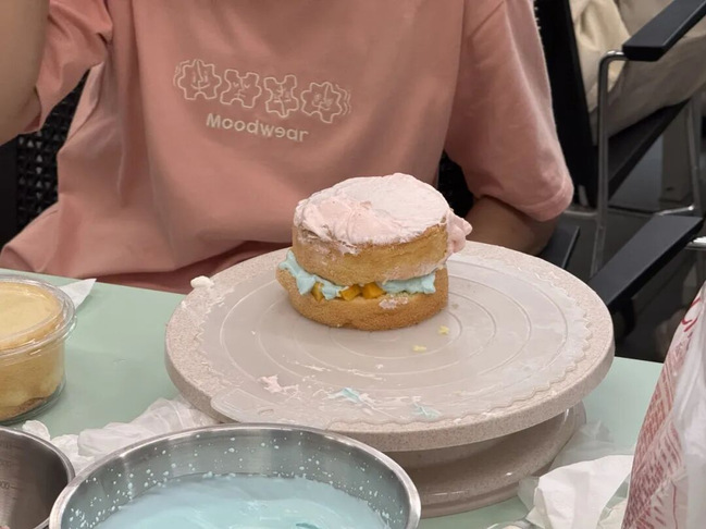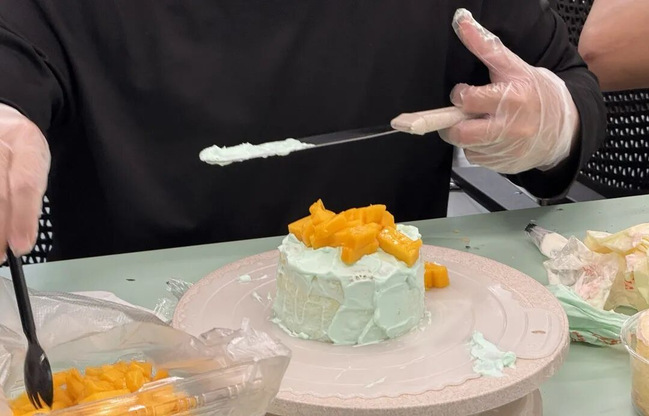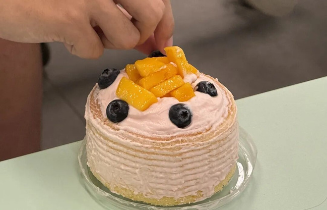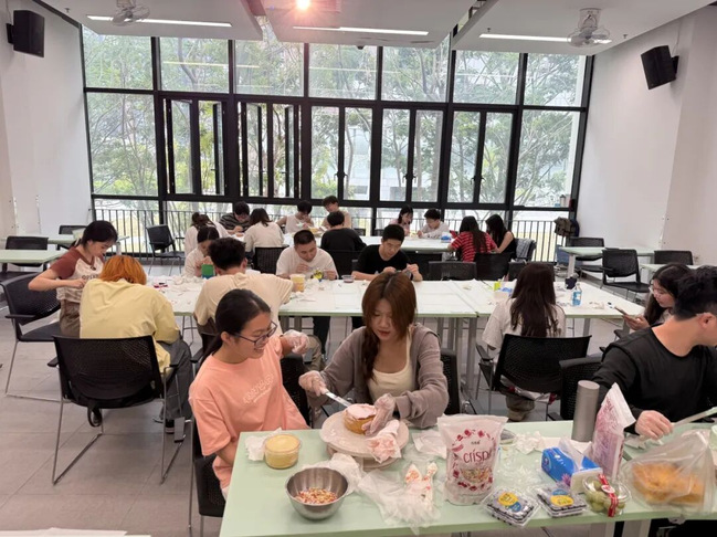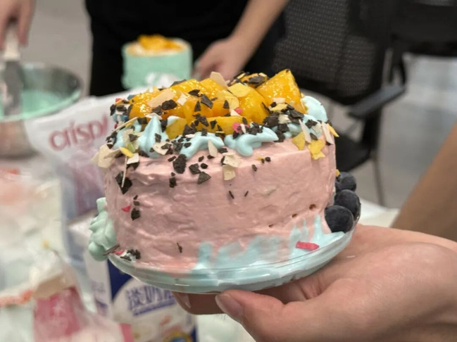 宿生会成员精心布置了专属烘焙台,奶油、缤纷糖霜和新鲜水果供同学们自由选择。“蛋糕胚如未琢璞玉,奶油似流动光阴”,这句开场白落下,现场被温暖的氛围笼罩。参与者们围坐着,轻轻放好蛋糕胚,手持抹刀,将奶油轻盈地铺展其上。有人不断调整抹刀角度,试图将奶油抹得更加平整,有人用裱花嘴勾勒出花的纹路。