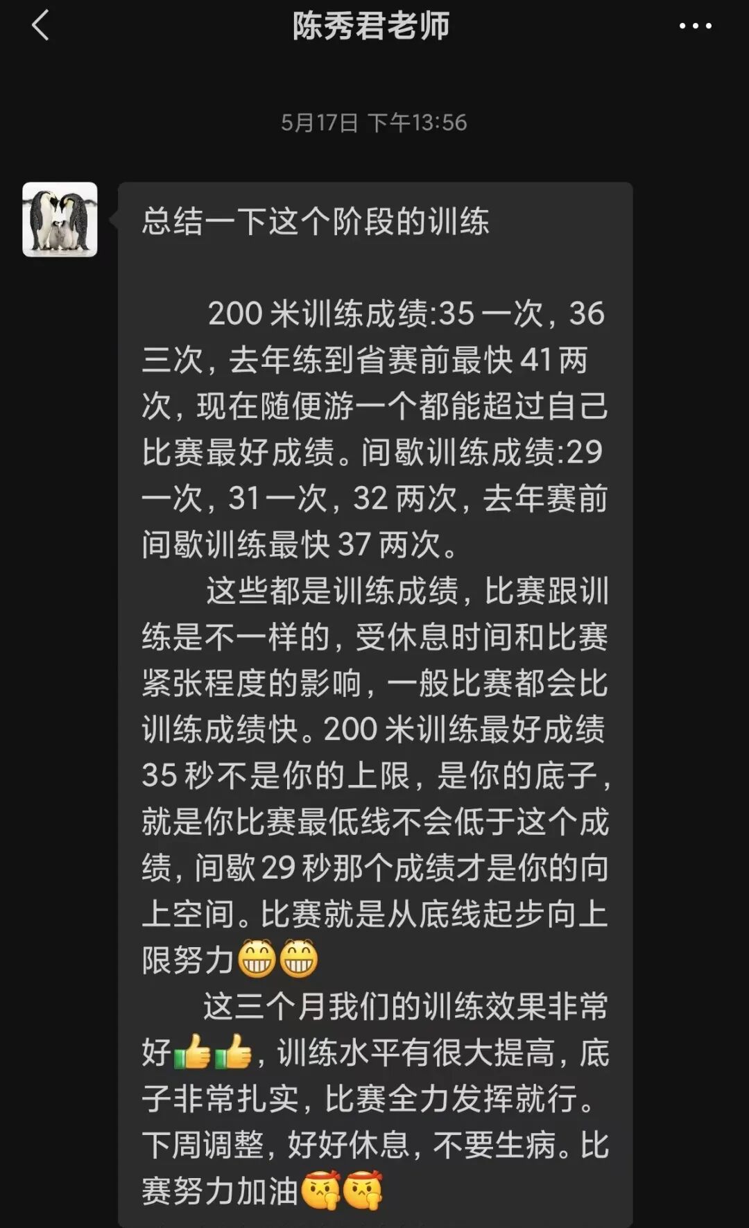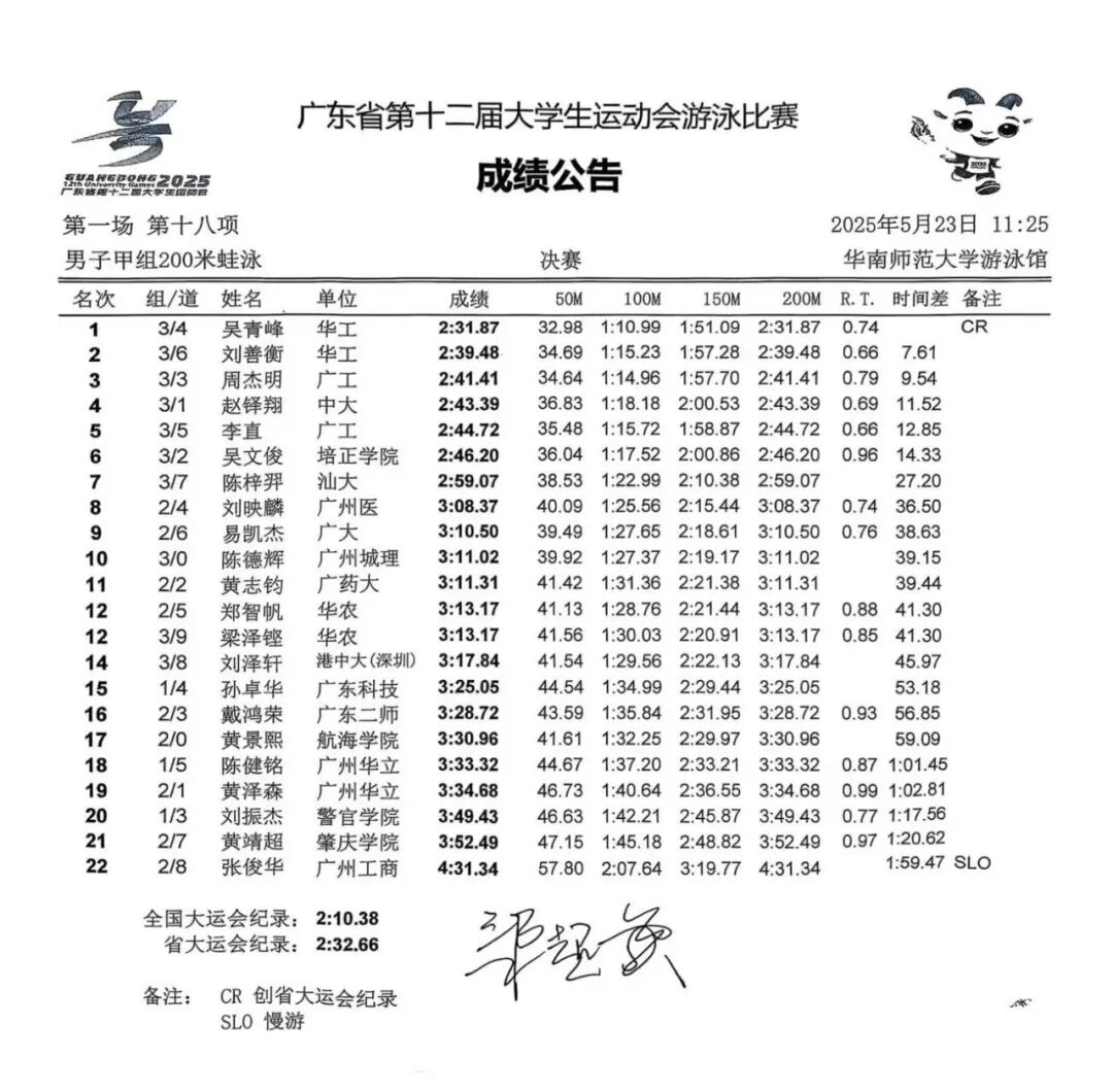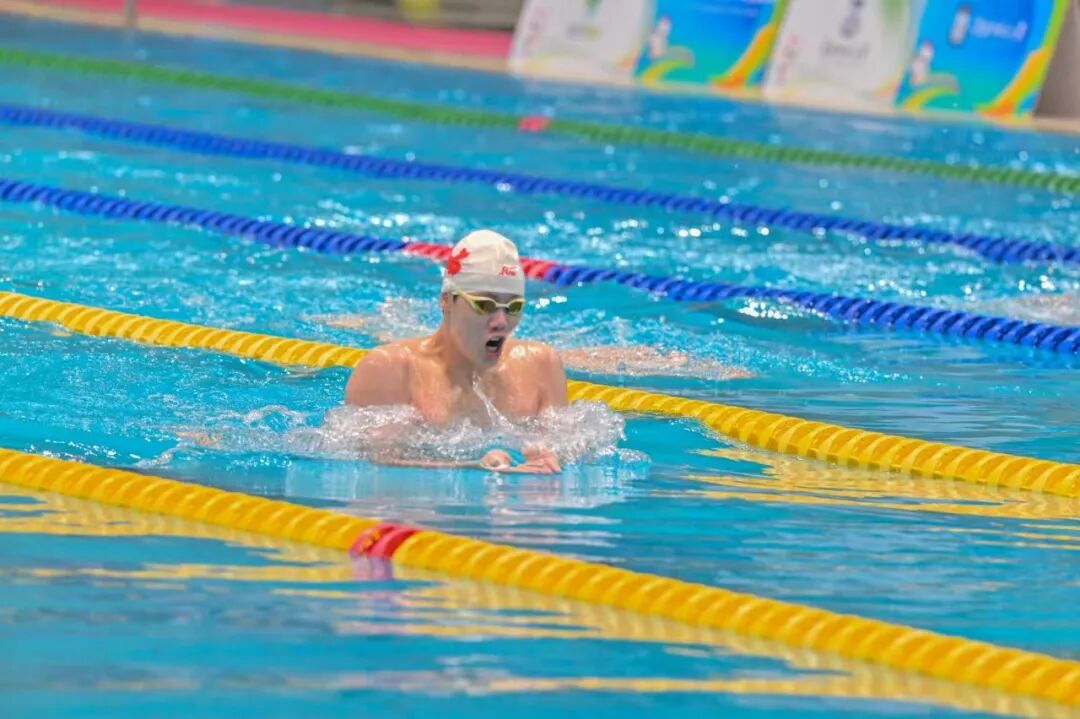 站在省大运会的出发台上,我放下了所有压力,告诉自己 “破得了是惊喜,破不了是正常”。发令枪响,我奋力向前,最终以 0.79 秒的微弱优势打破男子甲组两百米蛙泳赛会纪录,随后又与队友们一起打破 4*100 米自由泳赛会纪录。虽然 100 米蛙泳以 1分 6秒 95 的成绩夺冠,离纪录仅差 0.3 秒,略有遗憾,但这段在华园泳池边拼搏的日子,早已成为我青春中最闪耀的篇章。