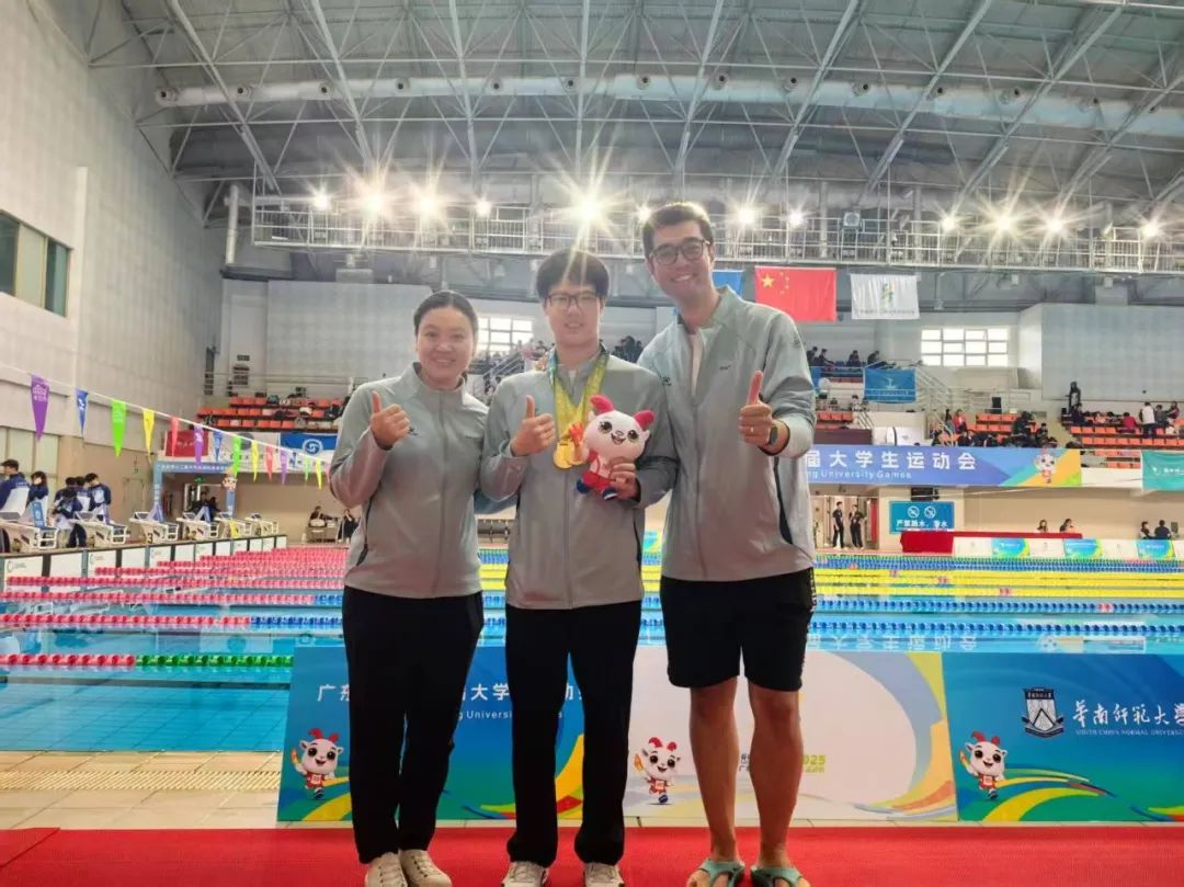 夺冠之路布满荆棘。大一上学期,国际校区泳池尚未开放,我每周都要乘坐校巴往返五山校区两次参加训练,路程两小时,训练却仅有一小时。但艰苦的付出终有回报,短短两个月,我的一百米自由泳成绩从 1分 6 秒提升到 57 秒,50 米蛙泳更是达到了一级运动员水平。在 12 月的全国赛决赛中,我以 0.1 秒的微弱优势战胜了两个月前曾碾压我的对手,夺得 50 米蛙泳单项银牌;在 4*100 米混合泳接力中,我作为最后一棒游自由泳,凭借 57 秒的出色成绩巩固优势,助力团队打破全国纪录并夺冠。