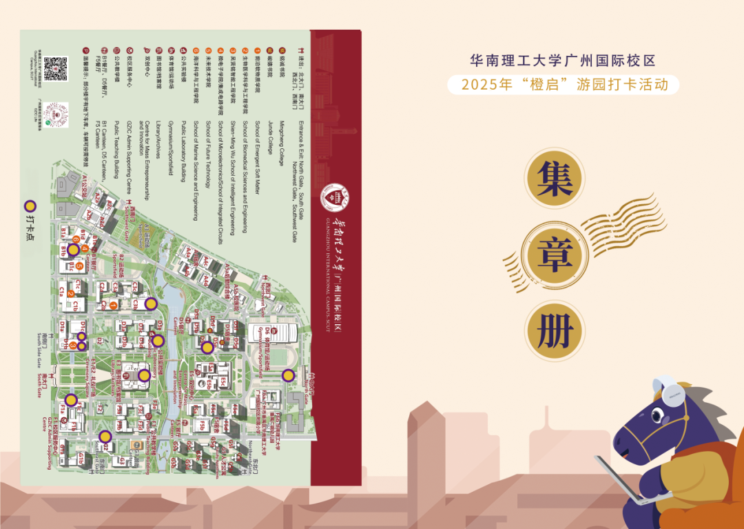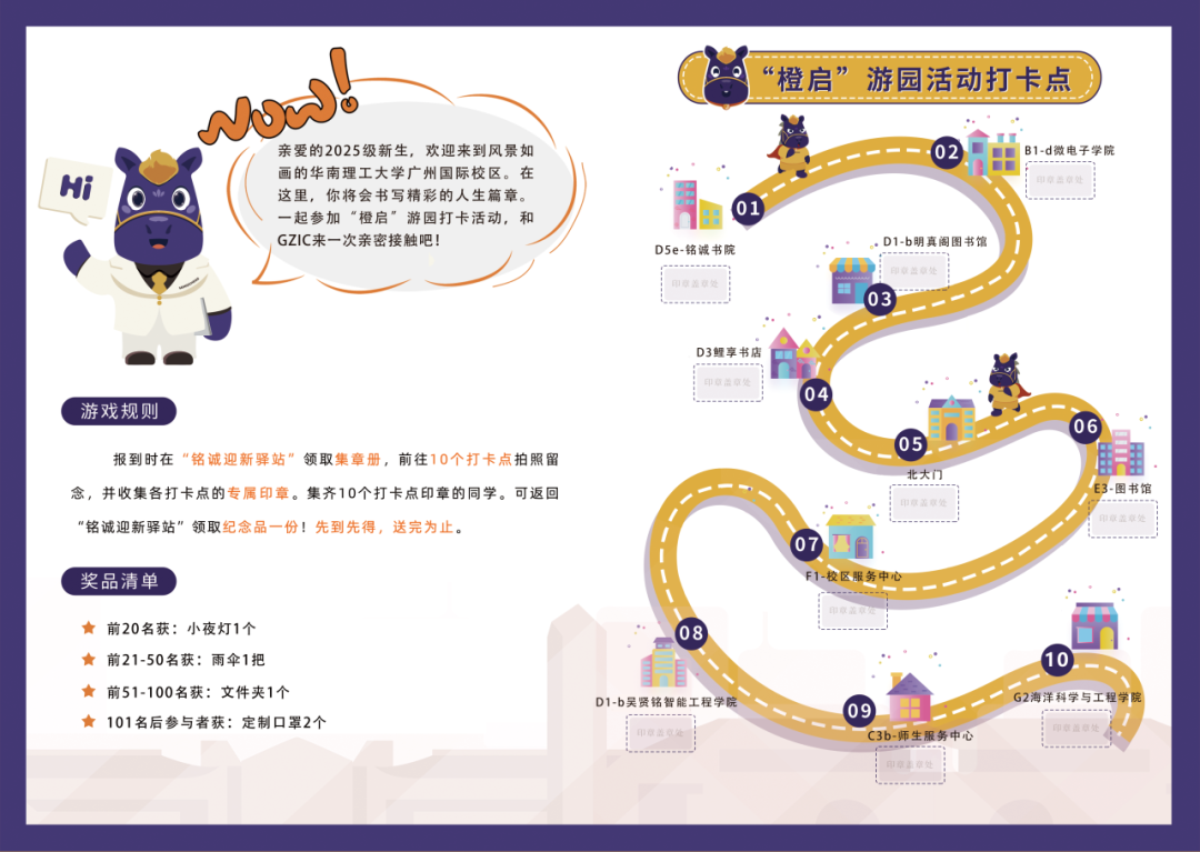 报到当天,你可以在任意一处“铭诚迎新驿站”拿到一本专属的“橙光游园打卡集章册”。沿着指引的路线,从书院到学院,从图书馆到师生服务中心,穿行在十处打卡点之间,用脚步把日常的学习、生活与探索路线走熟。每到一处都为自己盖下一枚印章,既是地图上的坐标,也是你与华园的第一次握手。