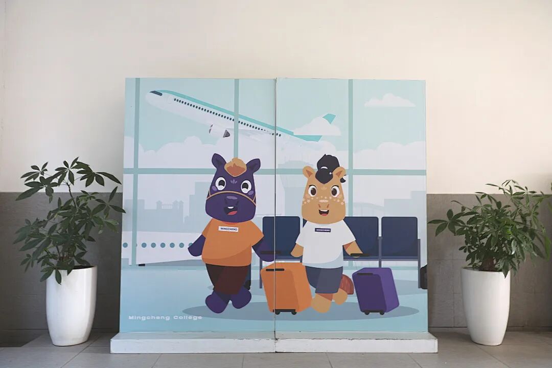 初到书院正门,橙红色的门面前赫然站立着书院吉祥物铭欣和诚然,它们欢欣雀跃地向大家问好——欢迎加入铭诚大家庭!