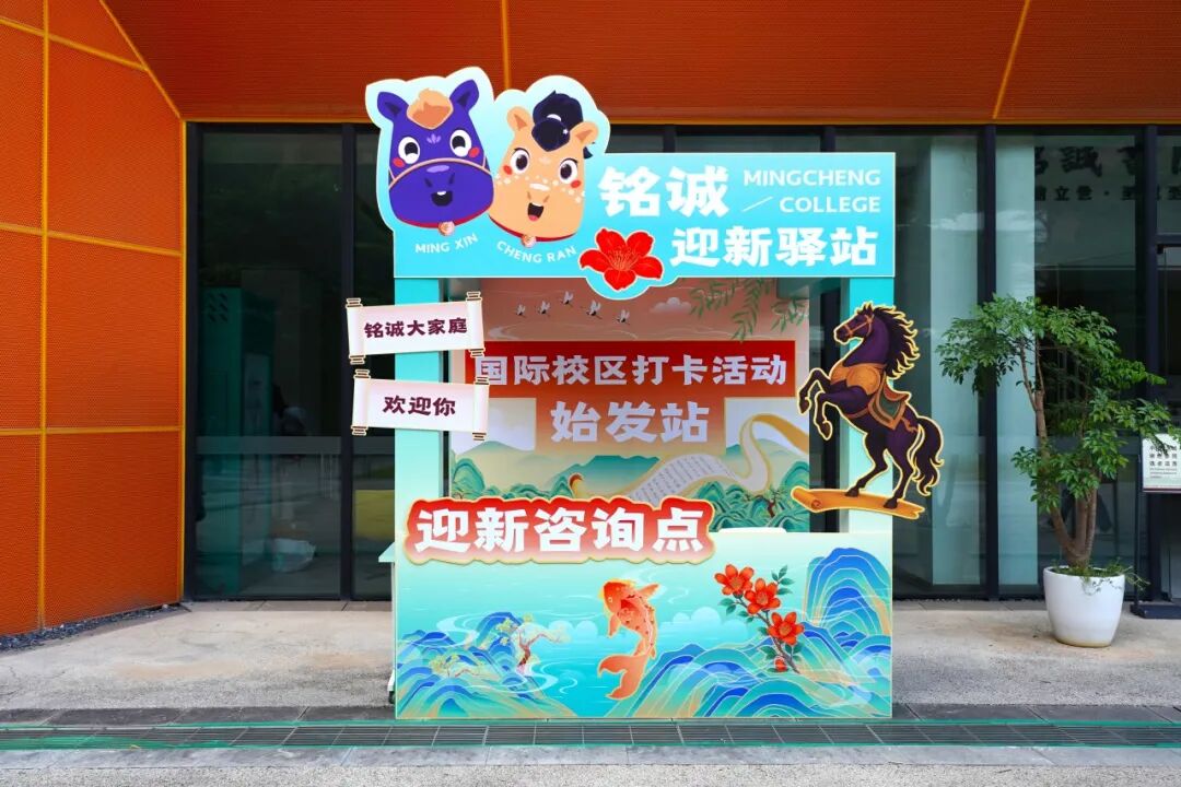 大门左侧也设有迎新驿站。大家今年的迎新驿站设计采用中国风,设计元素有木棉花、锦鲤、骏马,分别代表着广州、华园和书院。大家可在此咨询有关书院生活的各种问题,也可以从这里开始“橙启·游园打卡”活动。