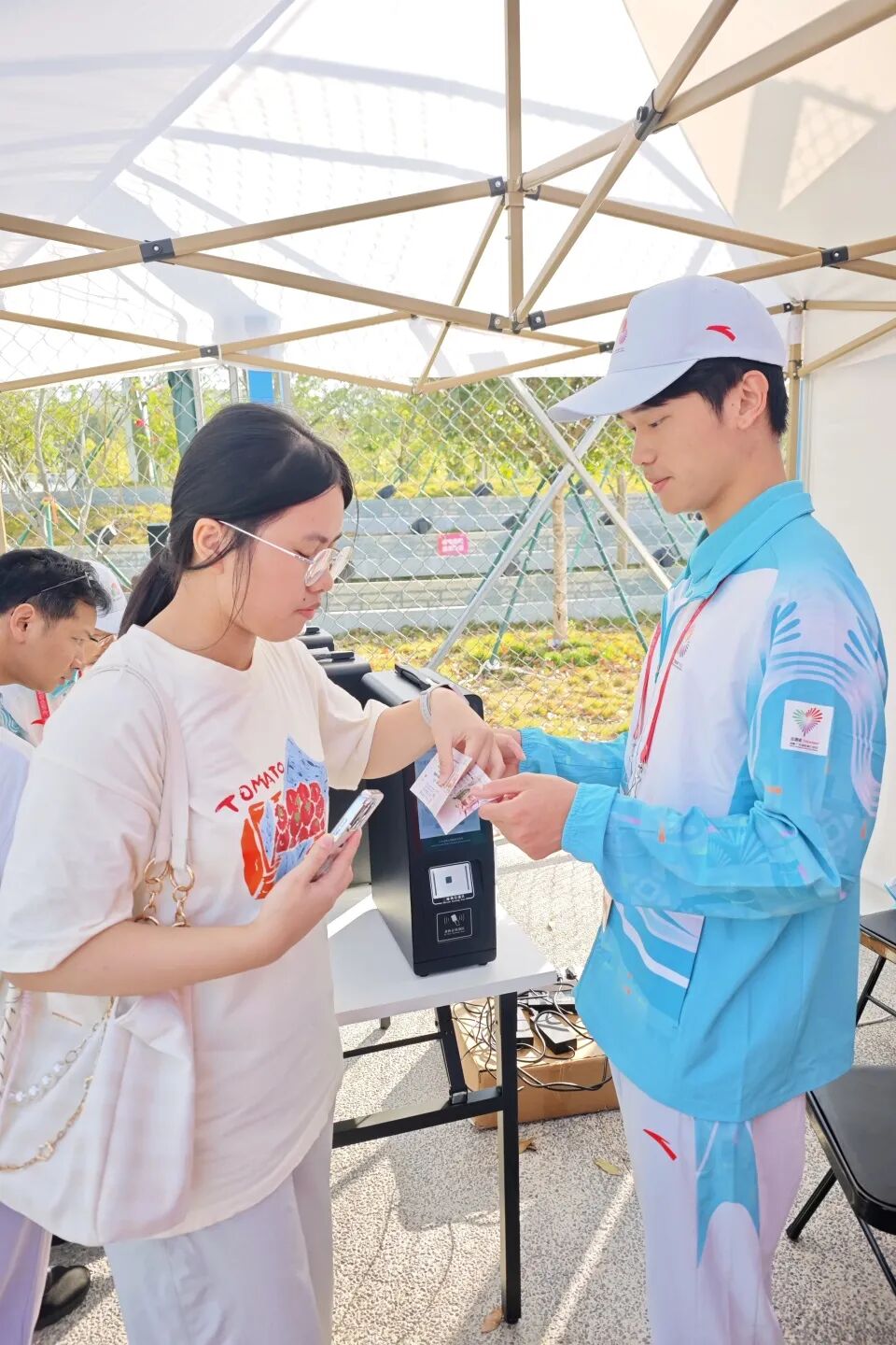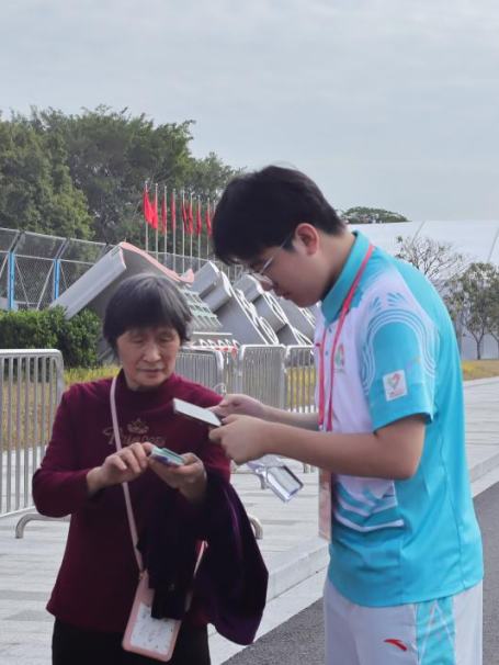 在田径赛服务中,我在赞助商服务处担任票务助理。每天早早到岗,帮助指引来观赛的观众换取纸质票。从一开始对换票设备操作尚不熟练,到后来逐渐总结出一套系统性的问题解决方法,能够从容应对各类换票状况。在换票工作任务相对轻的时候,我还会和票务工作的工作人员姐姐一起帮助想现场买票的老人家用手机购票。看着他们拿到纸质票时开心拍照的模样,我真切体会到“被需要”的价值,也读懂了志愿服务的温度所在。