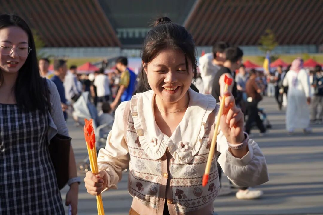 宿生会成员在旁耐心指导,为每位参与者送上书院文创,让大家在趣味互动中,感受“射以观德”的处世哲学。不同肤色、不同语言的身影轮番上阵,有人专注凝神,有人轻松尝试。箭矢飞落、起落交替成为了跨越隔阂、联结心灵的纽带。