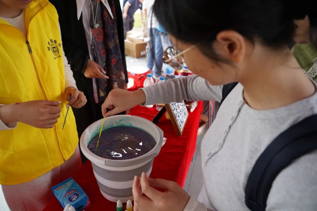 国际文化节上铭诚书院摊位前人头涌涌,排着一条长长的队伍,原来中外友人都踊跃参加投壶和漆艺的游园活动。