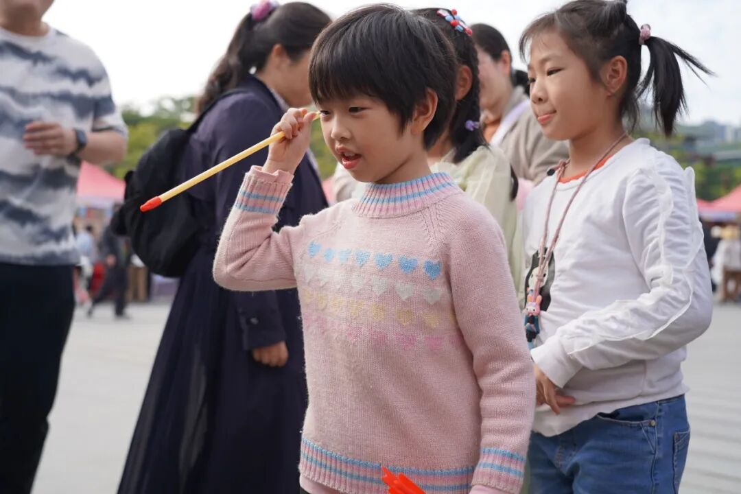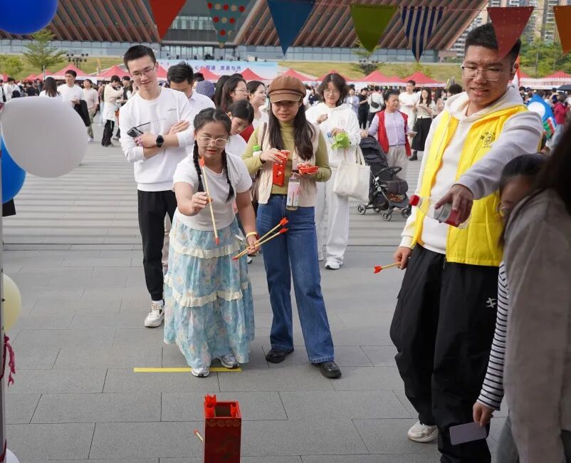 投壶,源自古时射礼,是古人将礼仪教化与闲情雅趣精妙相融的文化瑰宝。铭诚书院摊位前,壶具静静伫立,引得中外学生纷纷驻足。参与者手持箭矢,屏气凝神间校准方向,轻舒手腕将箭矢投出,每一次命中都伴着欢呼,偶尔的失手也化作相视一笑的乐趣。