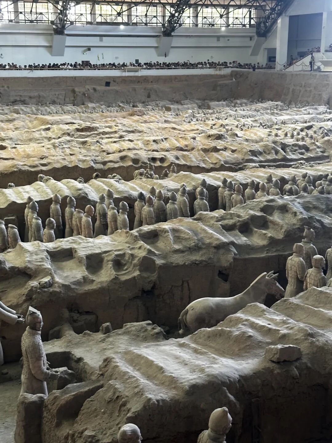踏入一号坑展厅时,最先撞入眼帘的是一片 “军阵海洋 ”。数千尊陶俑以 整齐的队列排布,前锋、主力、侧翼、后卫层次分明,仿佛一声令下,便能即刻 奔赴战场。站在高处俯瞰,陶俑们身高近两米,身着铠甲、手持兵器, 姿态各异却神情肃穆,连铠甲上的甲片纹路、腰间的束带结扣都清晰可辨。最让我震撼的是他们的“气势”:前排的士兵微微前倾身体,眼神锐利如鹰,似在警惕前方动静;后排的将领双手按剑,站姿挺拔,透着运筹帷幄的沉稳。导游说, 这是秦代“宿卫军”的缩影,还原了秦始皇统一六国后军队的真实建制。那一刻,我仿佛听见了两千多年前的号角声,看见了秦军挥师东进的壮阔场面——原来历史从不是课本上冰冷的文字,而是能通过这些陶俑,触摸到的、有温度的过往。