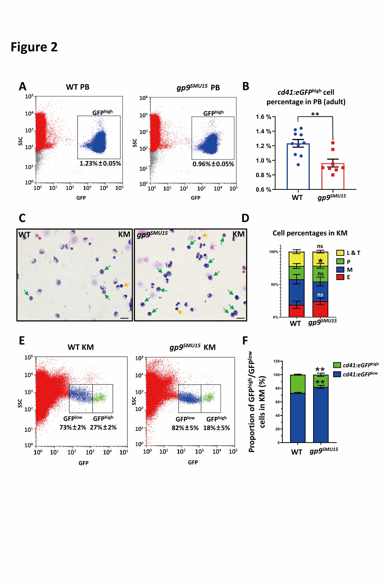 为了阐明gp9在血小板发育过程中的调控作用,研究者们利用CRISPR-Cas9方法构建了gp9缺陷的斑马鱼突变体。所获得的突变体gp9smu15(-17 bp,+0),其编码的蛋白预测结果提前终止,导致该蛋白质缺失了富含亮氨酸重复序列N端,富含亮氨酸重复序列C端和跨膜区的功能域。作者发现成年gp9smu15突变体血液循环中的血小板显著减少(cd41:eGFPhigh标记[7],如图1A和 1B),肾脏造血干祖细胞比例明显上升(图1C-F),表明了gp9smu15成年突变体中可能发生了血液细胞发育的阻滞,伴随较大的血小板计数增加,较小的血小板计数显著减少,类似于BSS临床病人的巨大血小板增多,成熟血小板减少。