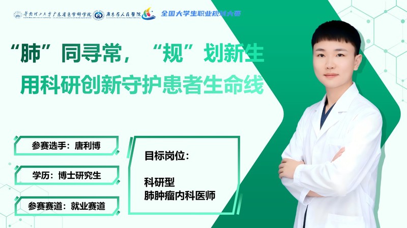 在本次比赛中,唐利博以成为一名“科研型肺肿瘤内科医师”为职业目标,系统展示了其成长路径。面对临床上肺癌研究面临的发病隐匿、机制未知、预后不佳、预防匮乏四大痛点,他迎难而上,参与多个科研项目的攻坚克难,为肺癌研究提供新方案、新思路。在成长的过程中,他从临床、科研、成果转化、综合素质等多个方面锤炼自我,努力成长为国家需要的能“揭榜挂帅”的医学人才。