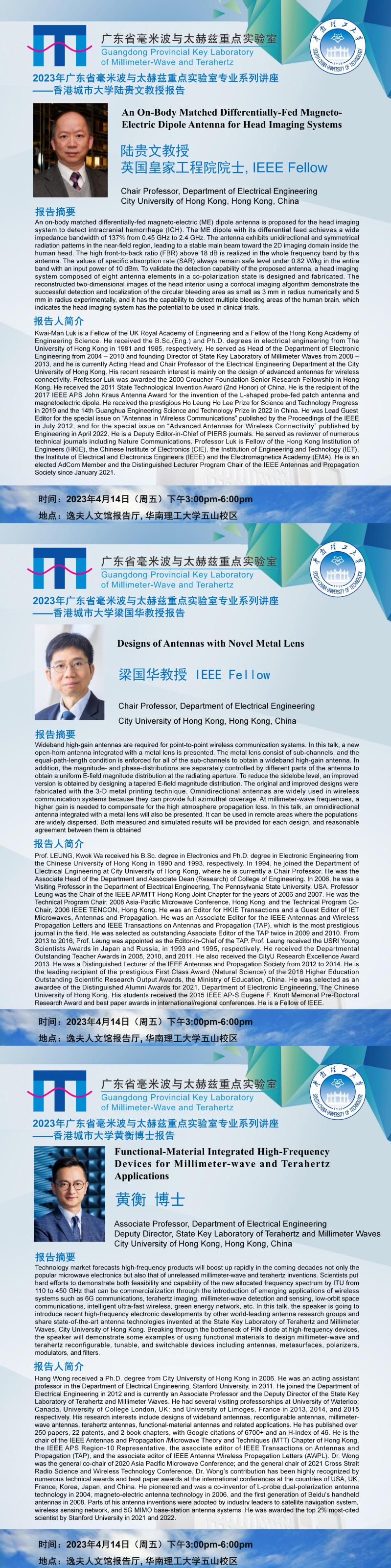 关于2023年广东省毫米波与太赫兹重点实验室专业系列讲座(香港城市大学陆贵文教授、梁国华教授、黄衡博士报告)