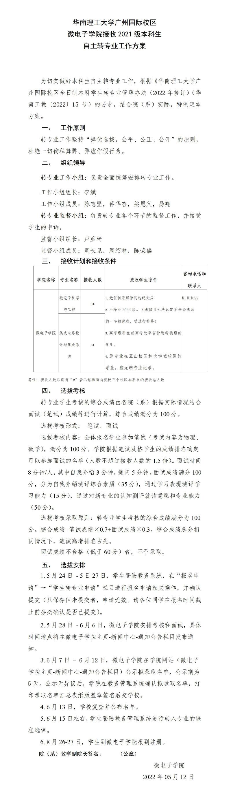 华南理工大学广州国际校区微电子学院接收2021级本科生自主转专业工作方案