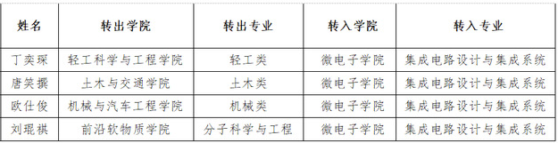 根据《华南理工大学全日制本科生转专业管理办法》(华南工教(2021)35号)的文件精神及教务处《关于认真做好2021级本科生自主转专业工作的通知》的相关规定,经学生个人申请,院(系)面试,现拟定2021级自主转专业到微电子学院的学生名单如下,现予以公示。