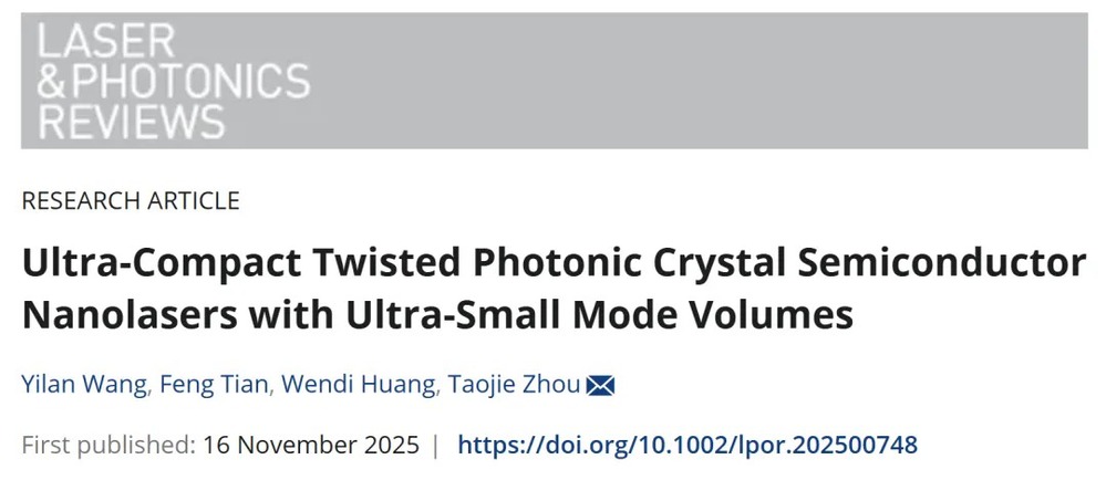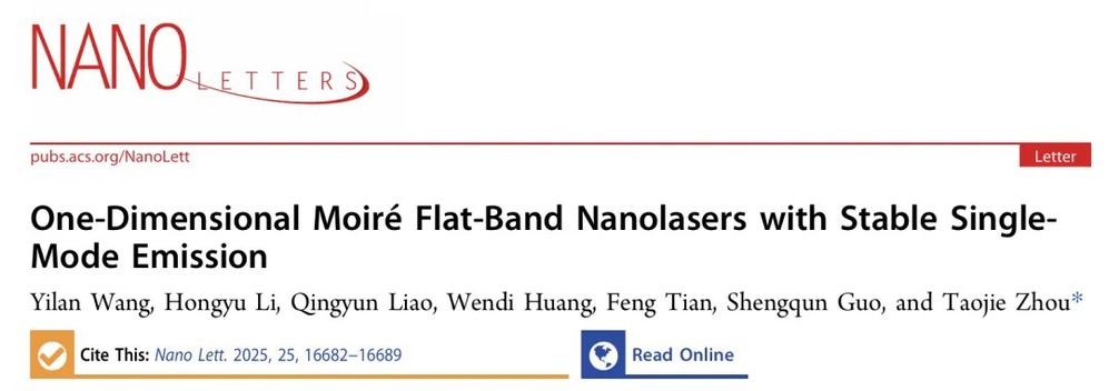 Recently, the research team led by Associate Professor Zhou Taojie has made new progress in the field of photonic crystal semiconductor nanolasers operating in the 1550 nm optical communication band. Their research results were published under the title Ultra-Compact Twisted Photonic Crystal Semiconductor Nanolasers with Ultra-Small Mode Volumes in Laser & Photonics Reviews on November 16, and under the title One-Dimensional Moiré Flat-Band Nanolasers with Stable Single-Mode Emission in Nano Letters on November 14. The aforementioned research was independently completed by Associate Professor Zhou Taojie’s team, with South China University of Technology as the sole affiliated institution. Yilan Wang, a master's student enrolled in 2023, is the first author, and Associate Professor Zhou Taojie is the corresponding author.