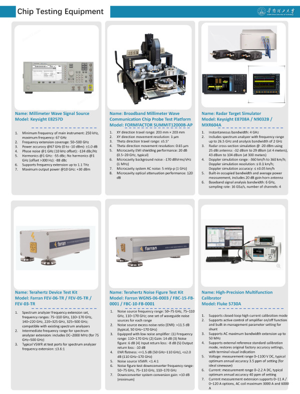 2. Chip Testing Equipment (49 units): Internationally advanced chip testing equipment covering a wide frequency range from RF to millimeter-wave to terahertz (110 GHz network analyzer, signal generator, signal analyzer, high-frequency oscilloscope, spectrum analyzer, ultra-wideband MIMO system, 5G wireless test platform, millimeter-wave load-pull system, microwave probe station, etc.).