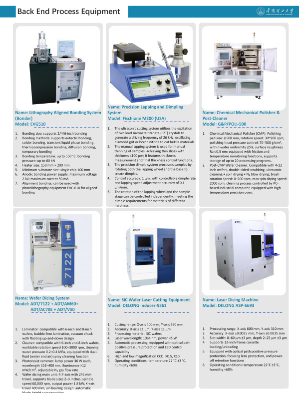 4. Micro-System Packaging Equipment (10 units): High-end wafer-level alignment and packaging tools (double-sided mask aligner, wafer bonder, chemical mechanical polishing system, wire bonder, wafer dicing system), providing robust hardware support for system integration technology development.
