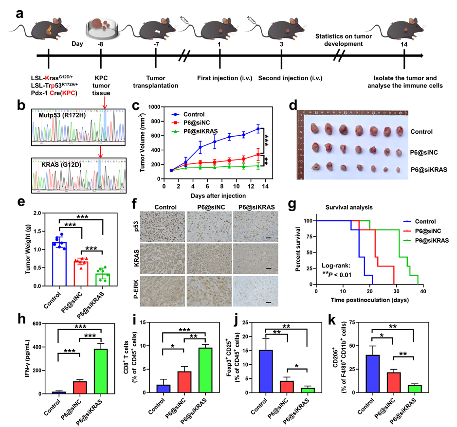 (3)体内实验结果表明,P6@siKRAS双功能纳米颗粒在MIA PaCa-2双突变胰腺癌模型和LSL-KrasG12D/+; LSL-Trp53R172H/+; Pdx-1-Cre (KPC)自发胰腺癌模型中具有优异的抗肿瘤疗效。更重要的是,P6@siKRAS通过清除突变p53和突变KRAS蛋白,增强了肿瘤微环境中CD8+ T细胞的浸润水平,重塑了肿瘤免疫微环境,从而显著抑制肿瘤生长。