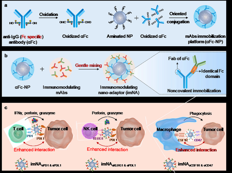 近年来,肿瘤免疫治疗,尤其是免疫检查点阻断疗法发展迅速并在深刻改变着恶性肿瘤的治疗格局。单克隆抗体(单抗)药物在肿瘤免疫治疗中广泛应用,但其抗肿瘤疗效及临床应答率仍有待大幅提升,构筑能同时识别两种细胞表面抗原的双特异性抗体是重要的解决方向之一。将两种单抗固定在纳米载体表面可以模拟双特异性抗体的功能,但亟待研发双特异性抗体便捷制备的纳米平台技术,突破化学键合抗体药物分子易损伤药物活性的技术瓶颈。鉴于临床应用及处于临床前试验的治疗型单抗药物的Fc段是高度一致的,该研究组创新性地提出利用能够特异性识别抗体Fc段的抗体,即抗Fc抗体[anti-IgG (Fc specific) antibody, αFc],从而构筑出通用型“抗体固定平台”(图a),通过简单的物理混合即可便捷、高效、可控地制备出新型双特异性纳米抗体(命名为“免疫调节纳米适配子”),实现单抗的“多价化”、“双特异性性”和“多功能化”(图b)。相较于传统单抗药物,纳米适配子不仅能够调节免疫细胞的功能,还能显著增强免疫细胞(包括T细胞、巨噬细胞、自然杀伤细胞等)与肿瘤细胞的相互作用,有效提高单克隆抗体药物的抗肿瘤效应(图c)。据了解,沈松副教授和王均教授研究组正致力于纳米适配子系统的优化和工艺放大,以期加速新型双/多特异性纳米抗体的临床转化和应用。