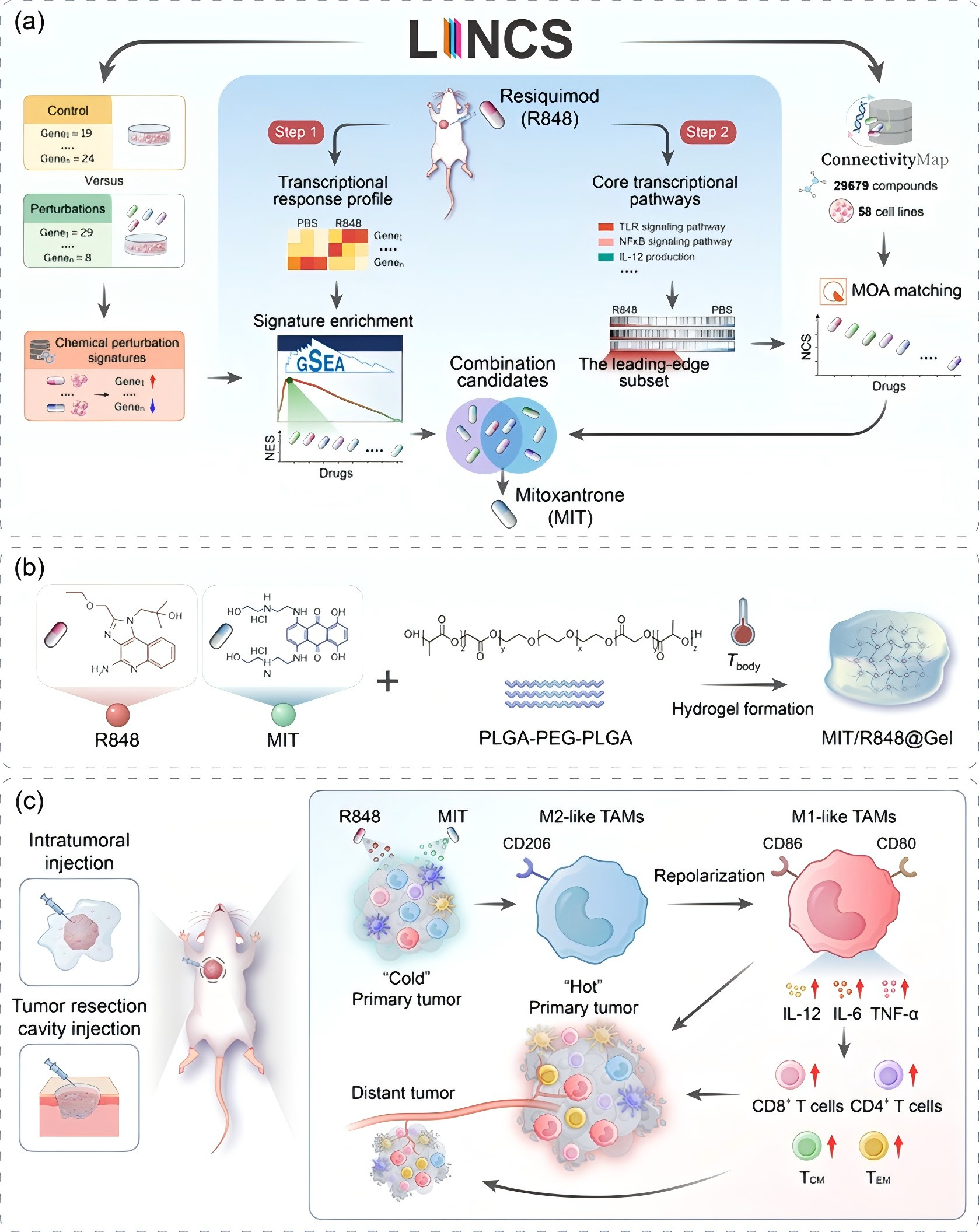 基于PSEA的药物发现与水凝胶递送用于肿瘤免疫治疗的示意图。(a)PSEA方法筛选MIT作为R848组合搭档的流程图;(b)温敏水凝胶共载MIT和R848;(c)作用机制:水凝胶重编程巨噬细胞并激活全身性抗肿瘤免疫。