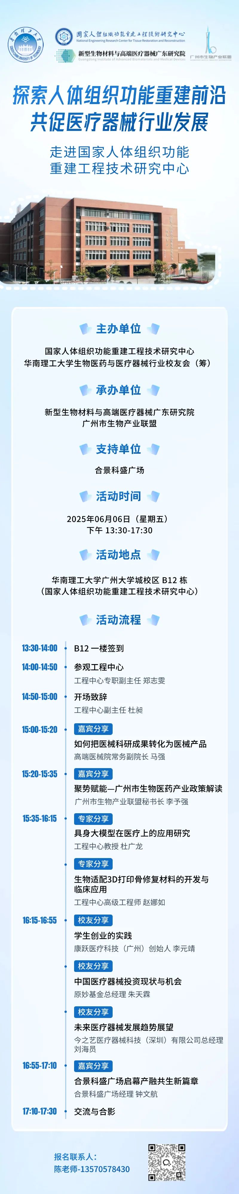 为促进产学研深度融合,提升校友互动,加强行业协同,推动医疗器械行业创新发展,国家人体组织功能重建工程技术研究中心、华南理工大学生物医药与医疗器械行业校友会(筹)、广州市生物产业联盟、新型生物材料与高端医疗器械广东研究院等单位,将于2025年6月6日举办题为“探索人体组织功能重建前沿,共促医疗器械行业发展”的交流活动,共探前沿技术与产业发展路径。
