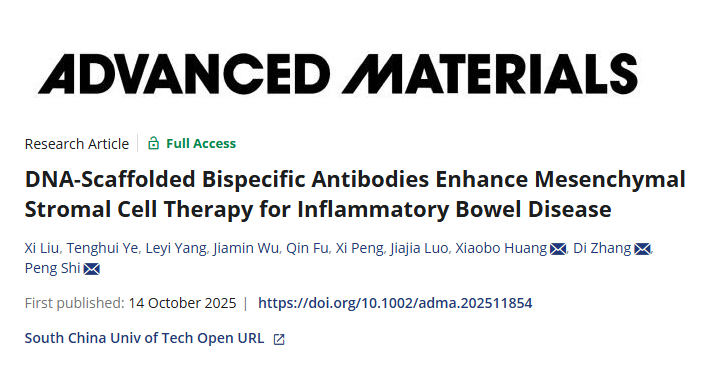 国家人体组织功能重建工程技术研究中心石鹏教授团队在Advanced Materials(IF=26.8)杂志上发表了一篇题为《DNA-Scaffolded Bispecific Antibodies Enhance Mesenchymal Stromal Cell Therapy for Inflammatory Bowel Disease》的文章。