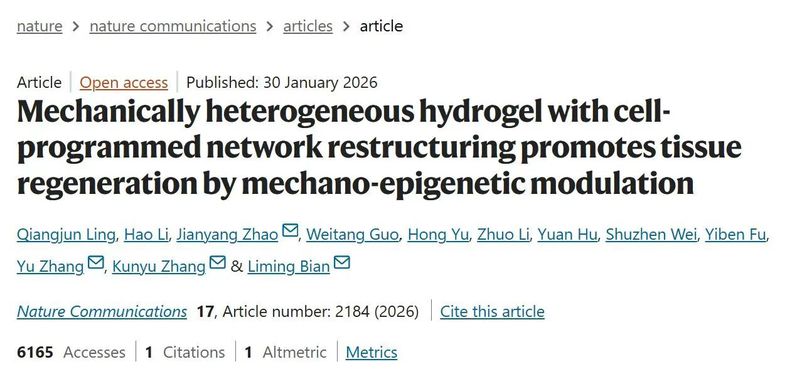 国家人体组织功能重建工程技术研究中心边黎明教授课题组在 Nature Communications(IF=15.7)杂志上发表了一篇题为《Mechanically heterogeneous hydrogel with cell-programmed network restructuring promotes tissue regeneration by mechano-epigenetic modulation》的文章。