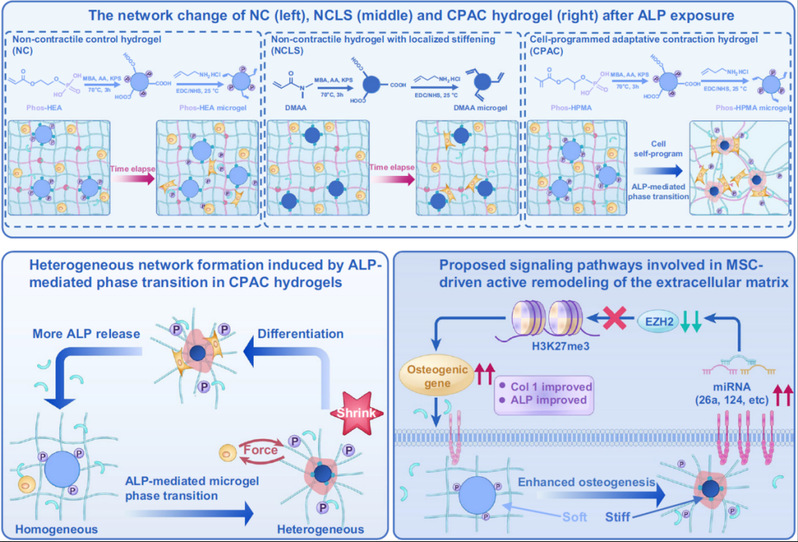 初始均匀网络模拟早期未矿化骨ECM:通过动态主客体交联构建柔软均匀的水凝胶网络,支持间充质干细胞(MSC)的增殖与存活,维持初始干性。细胞驱动的异质性网络模拟发育中骨ECM:MSC分泌的ALP催化微凝胶中磷酸酯水解,触发微凝胶体积收缩,诱导局部基质致密硬化,形成软硬相间的力学异质结构。包裹其中的MSC感知这种异质性后,激活力学传导通路(pFAK、paxillin、pMyosin IIa上调),并通过miR-124-3-1/miR-214/miR-26a介导的表观遗传调控(抑制EZH2、降低H3K27me3)增强成骨基因(Runx2、ALP、Col1、OPN)表达。该水凝胶系统通过细胞自身分化标志物(ALP)驱动的相变与网络重塑,实现了对骨修复过程中ECM力学异质性的时序性模拟,并建立“细胞分泌ALP→基质硬化→促进成骨→更多ALP分泌”的正反馈循环,为干细胞命运调控及骨组织再生提供了智能化材料平台。