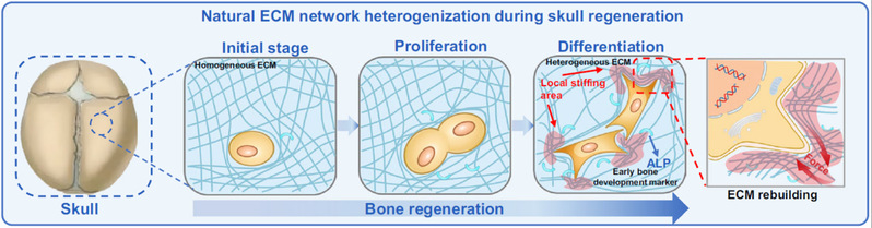 在骨修复过程中,细胞外基质(ECM)的生物物理信号对干细胞命运同样具有关键的调控作用:早期骨修复阶段,间充质干细胞所处的ECM呈现松散交联、力学均质的未成熟结构,支持细胞的快速增殖与团簇扩张,并为后续分化储备必要的细胞数量;随着发育进程推进,ECM因细胞分泌的酶(如碱性磷酸酶)介导的分子聚集与交联而逐渐成熟,形成包含刚性胶原纤维与柔软多糖基质的复杂异质结构,其局部刚度显著增加,诱导干细胞通过增强力学感知与粘附实现向成骨细胞谱系的分化,从而启动骨基质沉积与矿化。然而,如何在体外模型中复现上述阶段特异性的ECM动态演变仍面临挑战。传统预成型水凝胶支架因结构静态、无法响应细胞行为而难以模拟发育过程中ECM的时序性重塑;现有动态水凝胶虽可实现刚度调控,但缺乏与干细胞分化标志物的直接耦合,导致材料演变与细胞发育节奏脱节,限制了其对复杂组织再生的指导能力。