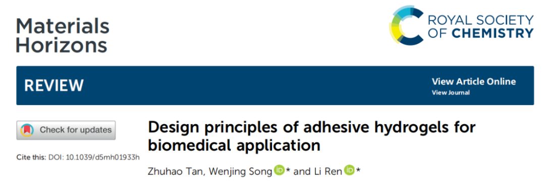 国家人体组织功能重建工程技术研究中心任力教授课题组在Material Horizons(IF=10.7)杂志上发表了一篇题为《Design principles of adhesive hydrogels for biomedical application》的综述文章。