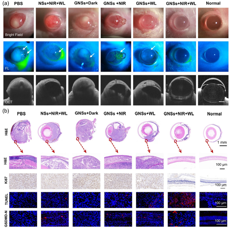 所得材料兼具优异生物相容性、近红外区荧光成像能力、稳定温和光热转化以及高效I型活性氧生成能力;其主要性能归因于AIE光敏剂与MXene的功能耦合、正电荷促进肿瘤细胞摄取、溶酶体逃逸后的线粒体靶向,以及凝胶网络带来的受控释放与局部滞留。与此同时,材料还表现出较好的抗缺氧光动力治疗适应性、抑菌能力和眼内给药安全性,这些次级优势分别来源于I型活性氧电子转移机制、MXene锐利边缘与表面电荷作用、以及凝胶在温和温升下的可控释药和局部低系统毒性特征。得益于上述结构设计与性能协同,该研究不仅拓展了眼内肿瘤精准诊疗与长效局部给药的应用场景,也为焦亡介导的协同光疗和可注射智能凝胶平台提供了新的材料设计范式,具有重要的科学意义与临床转化潜力。