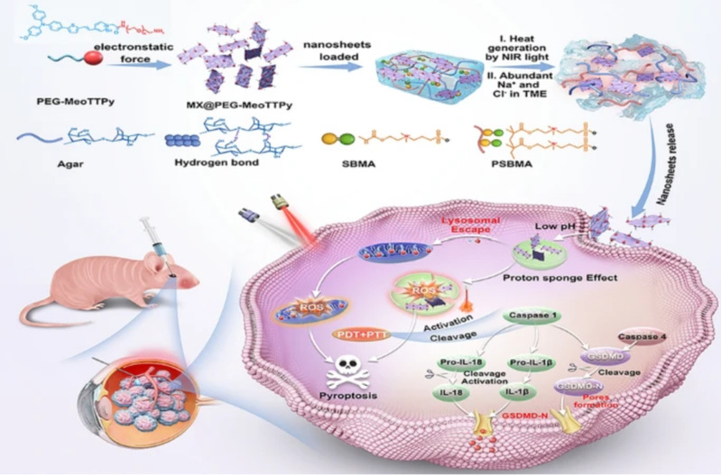 具体而言,研究团队通过静电作用将带正电、具I型活性氧产生能力的PEG-MeoTTPy负载到Nb₂C MXene纳米片表面,构建MX@PEG-MeoTTPy纳米片,并利用Agar与PSBMA双网络构筑可注射、具肿瘤微环境/近红外响应的凝胶递送系统GNSs。