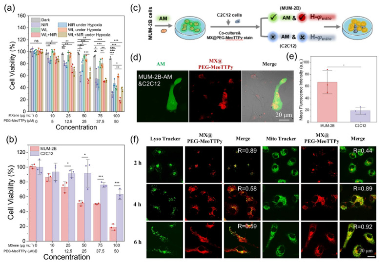 图4 中文图注:MX@PEG-MeoTTPy 纳米片的细胞内行为。(a)MUM-2B 细胞经不同浓度 MX@PEG-MeoTTPy 纳米片处理后,在有或无 808 nm NIR 激光(NIR,0.8 W cm−2,5 min)和/或白光(WL,20 mW cm−2,10 min)条件下的细胞活力;无缺氧标注的组别为常氧条件,孵育时间为 6 h。(b)MUM-2B 与 C2C12 细胞经不同浓度 MX@PEG-MeoTTPy 纳米片处理后的细胞活力比较(NIR,0.8 W cm−2,5 min;WL,20 mW cm−2,10 min),孵育时间为 6 h。(c)MX@PEG-MeoTTPy 纳米片区分癌细胞与正常细胞的示意图。(d)混合培养的 MUM-2B 细胞(预先用 calcein AM 染色)与 C2C12 细胞在 MX@PEG-MeoTTPy 纳米片(MXene 浓度:100 μg mL−1;PEG-MeoTTPy 浓度:50 μM)中孵育 4 h 后的 CLSM 图像。比例尺:20 μm。(e)图(d)对应的荧光强度。(f)混合培养的 MUM-2B 细胞(预先用 calcein AM 染色)与 C2C12 细胞在 MX@PEG-MeoTTPy 纳米片(MXene 浓度:100 μg mL−1;PEG-MeoTTPy 浓度:50 μM)中孵育 4 h 后的 CLSM 图像。比例尺:20 μm。