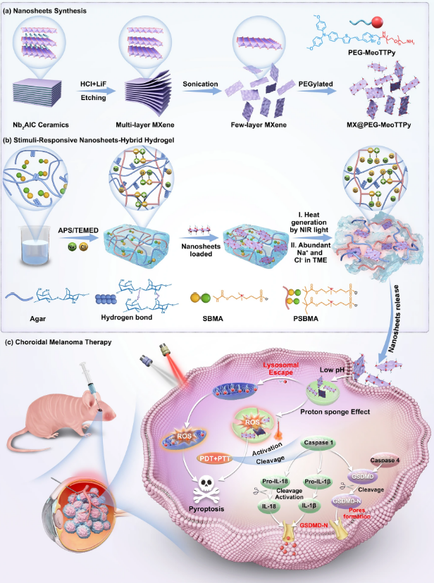 图1 中文图注:图示用于脉络膜黑色素瘤治疗的刺激响应型纳米片杂化水凝胶平台介导的焦亡型 mPTT/PDT 治疗示意图。(a)纳米片的合成路线。(b)刺激响应型纳米片杂化水凝胶的释放行为。(c)脉络膜黑色素瘤治疗机制。