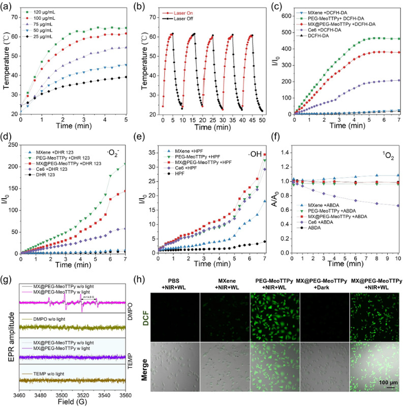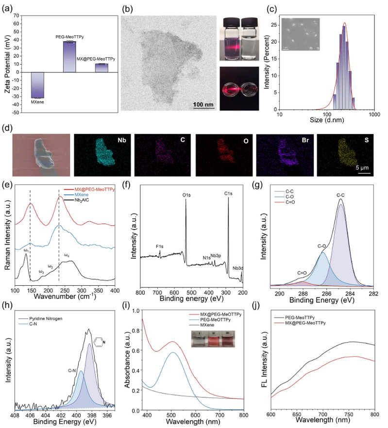 图2 中文图注:MX@PEG-MeoTTPy 纳米片的合成。(a)样品的 Zeta 电位。(b)MX@PEG-MeoTTPy 纳米片的 TEM 图像及其悬浮液的 Tyndall 效应。(c)MX@PEG-MeoTTPy 的粒径分布。(d)MX@PEG-MeoTTPy 的 SEM–EDS 分析。(e)样品的 Raman 光谱。(f–h)MX@PEG-MeoTTPy 的 XPS 全谱,以及高分辨 C 1s 和 N 1s 谱图。(i)样品的 UV–vis–NIR 光谱。图(i)插图 I–III 分别为:I)MXene(浓度:100 μg mL−1)、II)PEG-MeoTTPy(浓度:50 μM)和 III)MX@PEG-MeoTTPy(MXene 浓度:100 μg mL−1,PEG-MeoTTPy 浓度:50 μM)的照片。(j)样品的荧光光谱。激发波长为 510 nm。