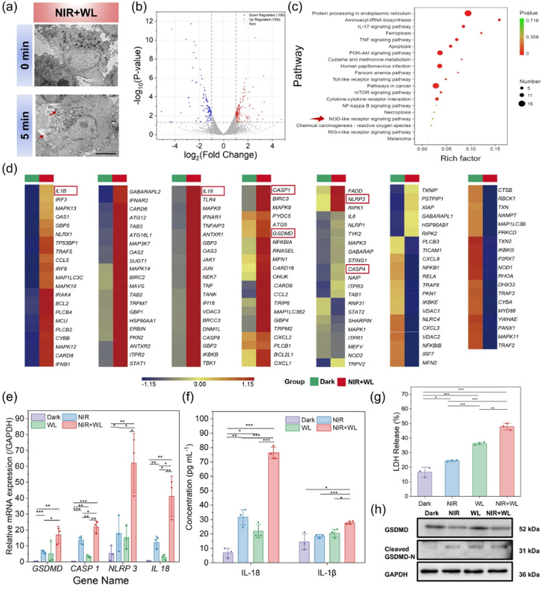 图5 中文图注:细胞焦亡研究。(a)MUM-2B 细胞中纳米片内吞及焦亡形态的 TEM 表征,红色箭头表示质膜孔洞和胞质液泡。(b)MUM-2B 细胞在光照处理(NIR 5 min,WL 10 min)与暗处理对照组之间全部差异表达基因的火山图。(c)KEGG 通路富集分析气泡图。(d)NIR+WL 组与暗处理组中 NOD-like receptor signaling pathway 相关组分的特异基因表达。红色和蓝色方块分别表示相对于暗处理组的基因上调和下调,红框中的基因为 NOD-like receptor signaling pathway 中的典型基因。(e)不同处理后焦亡相关基因的 qPCR 分析。(f)不同条件下,MX@PEG-MeoTTPy 纳米片处理的 MUM-2B 细胞中 IL-18 和 IL-1β 的 ELISA 检测结果。(g)MX@PEG-MeoTTPy 纳米片处理的 MUM-2B 细胞的 LDH 释放。(h)不同处理后焦亡相关蛋白的 Western blotting 分析。