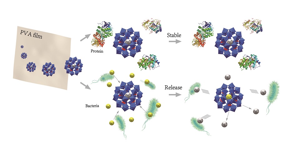 Preyssler-type POMs are known as the smallest POMs accommodating a cation within their cavity. In this study, a silver-containing polyoxometalates K13Na[AgP5W30O110] are explored to control the release of silver with activation mechanism. Nuclear magnetic resonance was used to monitor the release behavior of Ag+ in the experiment. AgP5W30 is stable in aqueous solution with the presence of transferrin and common metal ions that are rich in biological fluids, but releases Ag+ based on the ions exchange between Ag+ and Na+. The release rate of Ag+ is close to 100% when the molar ratio of Na+ to AgP5W30 exceeds 14:1. Moreover, the ions exchange reaction shows a high degree of selectivity to Na+, rather than Ca2+ or Zn2+. In subsequent resistance tests of Escherichia coli andStaphylococcus aureus, AgP5W30 also showed good anti-resistance, and the minimum inhibitory concentrations (MICs) remained unchanged for 20 incubation cycles, while the MICs of silver nanoparticles expanded at least 5 times after 9 incubation cycles. In addition, the AgP5W30-PVA composite films were prepared by the solution casting method. When the amount of AgP5W30 was 3% (w/w), the tensile strength of the composite film increased by 26.14%, and the elongation at break decreased by 6.59%, without significant change in thermal stability and surface morphology. In the test of inhibition zone, the composite films also showed good bacteriostatic effects for both both Escherichia coli andStaphylococcus aureus. Application of silver-containing polyoxometalates provides an effective method on controlled release of silver ions to fight against bacterial resistance.Few cases realize the controlled release based on the inorganic materials, especially for release with activation mechanism, it is also the first case for polyoxometalates used in ions-controlled release.