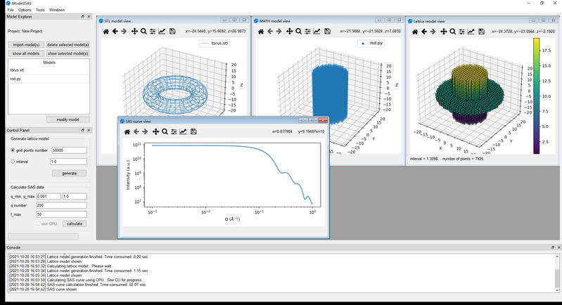 为了使用的方便,Model2SAS还提供了图形化用户界面(GUI),可以非常方便的进行模型导入、组合与散射曲线计算功能。过程中生成的数据与图像均可导出或保存,最大程度上方便用户使用。
