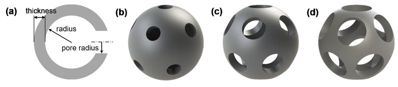 作为一个实例,我们对多孔球壳形状的SAS曲线进行了分析研究。多孔球壳目前尚无散射模型可用,我们使用建模软件建立了如图所示的不同孔径的多孔球壳并使用Model2SAS生成了相应的散射曲线。结果显示,球壳上的开孔对Guinier区与一级振荡峰并无明显影响,而第二个振荡峰的强度随着孔径增加而显著增加。这是首次对多孔球壳的散射数据进行分析。